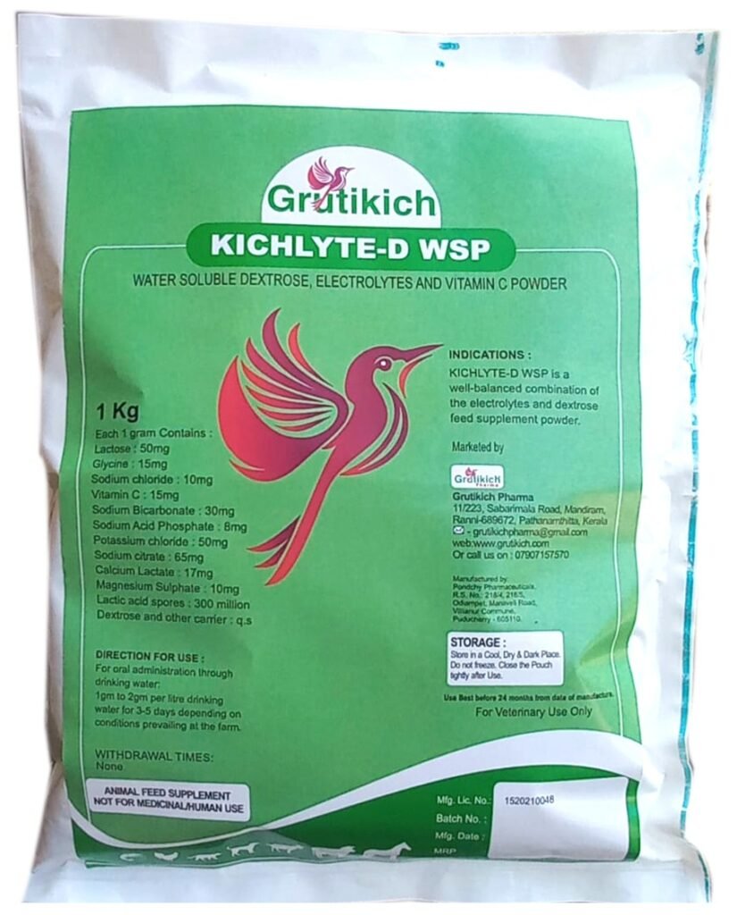 Kichlyte-D WSP  is a well-balanced combination of the electrolytes and dextrose in order to correct fluid and electrolyte losses and acid-base imbalances. Dextrose provides energy and enhances sodium absorption in the intestine.  Kichlyte-D WSP  for Compensating the Fluids and Electrolytes losses. In summer to avoid dehydration and heat stroke. Kichlyte-D WSP helps to recover from all stress conditions.